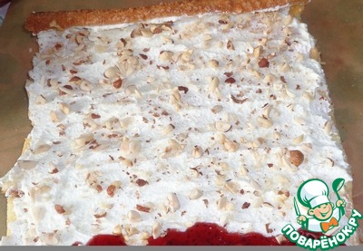Фундук измельчить и посыпать сверху на крем. На край пласта выкладываем клюквенный джем, когда свернем рулет, то серединка будет красная у рулета.