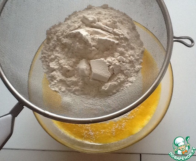 Смешайте муку, разрыхлитель, корицу, соль. Просейте все в миску с яйцами и аккуратно перемешайте смесь движениями снизу вверх.