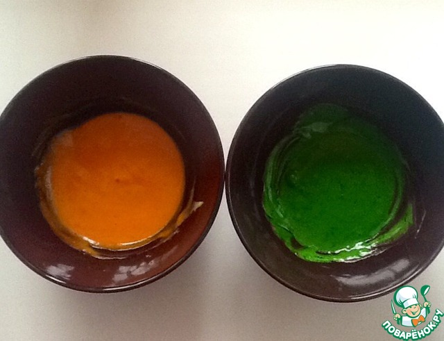 Отлейте немного теста в 2 тарелочки и добавьте пищевые красители