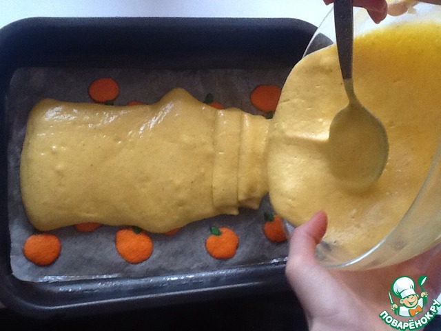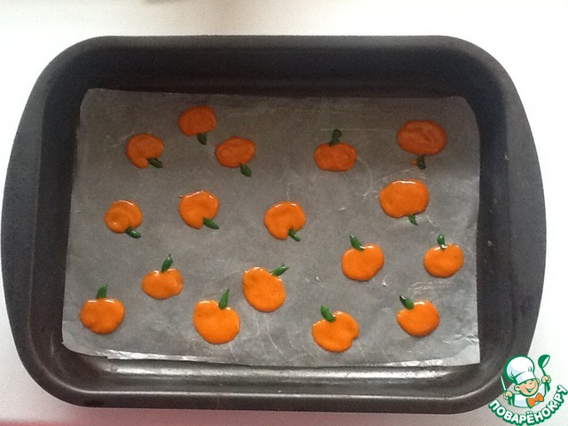Теперь аккуратно ложкой (или как вам удобно) выкладываем наше тесто в форме тыковок. Хвостики я выкладывала зубочисткой:)