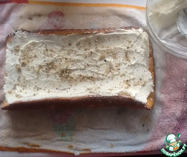 Выкладываем наш крем на ароматный корж, присыпаем орехами.