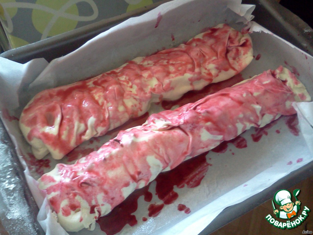 2) Тесто тонко раскатываем и выкладываем начинку, заворачиваем изделие, как простой рулет.