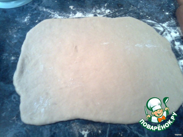 Тесто вымесить на посыпанной мукой поверхности и раскатать в виде прямоугольника.