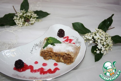 Завернуть штрудель, приподнимая край ткани. Если на штруделе оказалось немного муки, нужно промазать его малом. Аккуратно выкладывайте на смазанный маслом пергамент. Запекать при температуре 170 градусов 25-30 мин. Резать лучше ножом с пилочкой в остывшем виде.