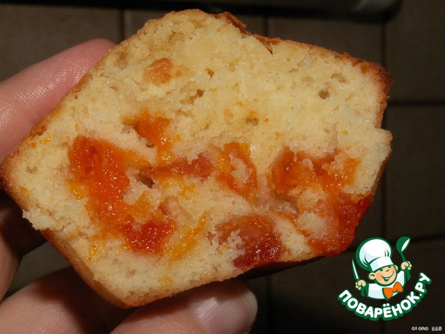 Далее добавить цедру, порезанную мелкими кубиками курагу и просеянную муку.