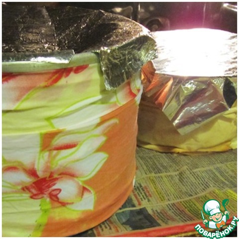 Чтобы кекс равномерно пропекся, остался сочным внутри и без засохших корок снаружи, очень важно правильно подготовить формы. (У меня 2 формы диаметром 18 см, но разной высоты.) Дно формы нужно застелить 2-3 слоями бумаги для выпечки, бока смазать сливочным маслом. Затем снаружи форму оборачиваю газетой, сложенной в длинную полосу, мокрой тканью и завязываю поверх веревкой, чтобы все это держалось.