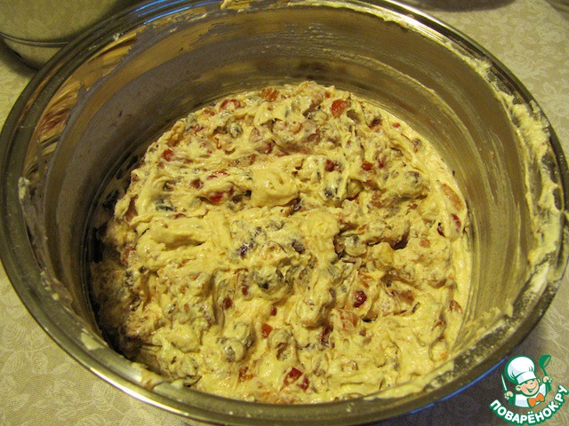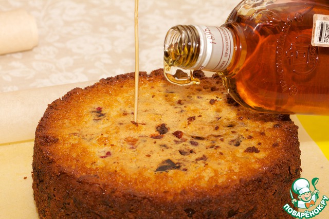 Когда кекс готов, можно полить его сверху парой ложек бренди, коньяком и пр. Можно даже наколоть поверхность и полить от души. Если детский вариант, то этот пункт опустить.