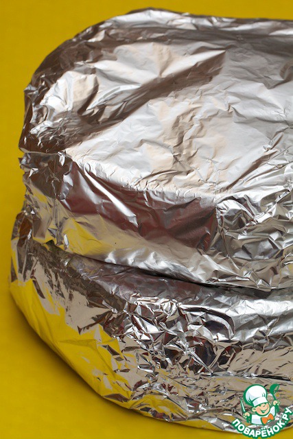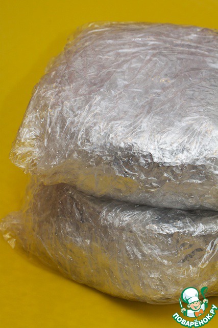 ... затем сверху пленку и дальше убираем его, я выношу на застекленную лоджию, чтобы он вылежался и вызрел там в течениe 2-х месяцев, в противном случае кекс будет крошиться.