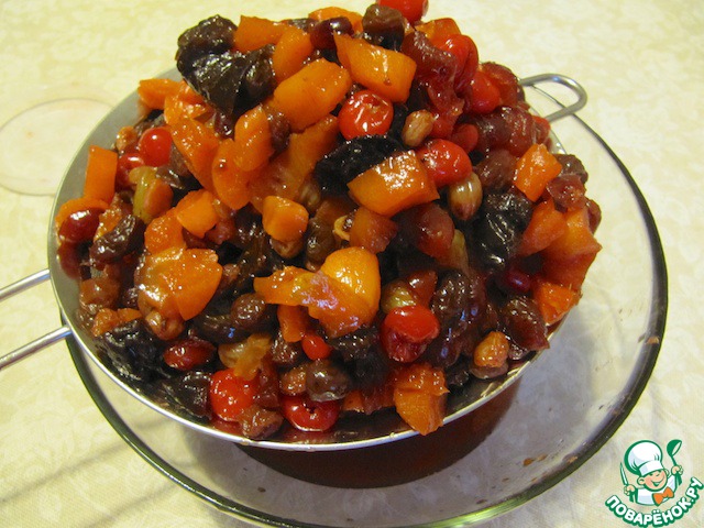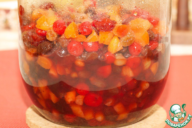 Фрукты замочить в бренди, коньяке или другом виде алкоголя, но можно и в соке или сладкой воде. Количество бренди для замачивания лучше определять на глаз и замачивать лучше в течение нескольких дней. Если фрукты замочены в герметично закрываемой емкости, то для равномерного пропитывания фруктов хорошо переворачивать ее (один день – крышкой вверх, другой день – крышкой вниз). Я залила фрукты в края, но по прошествии 3-х дней количество спиртного уменьшилось, я фрукты заметно увеличились в объеме.