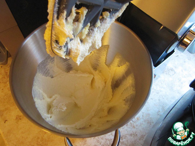 Заранее достаем масло и яца из холодильника, чтобы дать им согреться. Масло и сахар размешать в крем. Яйца взбить и добавить в масло, понемножку за раз. В процессе взбивания и перемешивания этих трех продуктов масло наверняка «отскочит», но это не должно вас беспокоить, все соединится после того, как вы добавите муку.