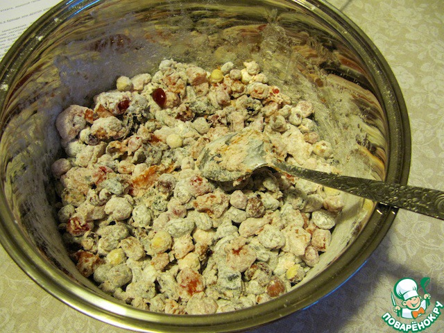 Нам нужно напитать сухофрукты влагой, чтобы они потом не забирали ее из теста и тем самым не пересушивали кекс. Для этого нужно помыть сухофрукты, слегка высушить - пусть полежат в дуршлаге. Для того, чтобы структура кекса была более однородной без пустот, чтобы сделать кекс более плотным и однородным, фрукты рекомендуется порезать на маленькие кусочки одинакового размера. Например, если кишмиш мелкий, то изюм режется пополам в размер кишмиша и так далее.
