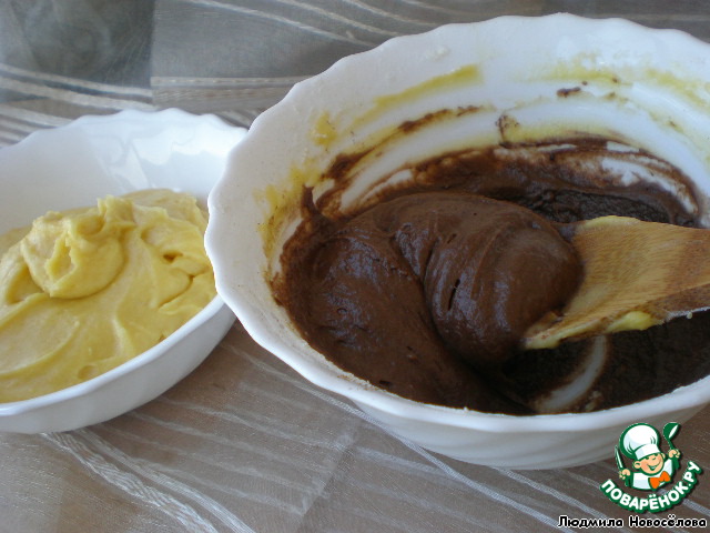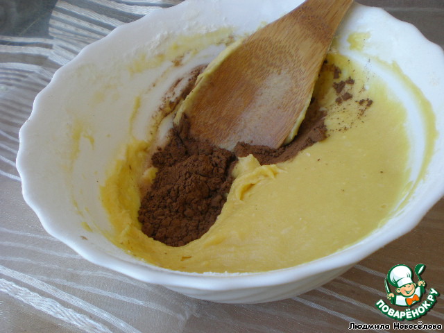 Тесто разделить на 2 части, в одну добавить какао-порошок, молоко, размешать.