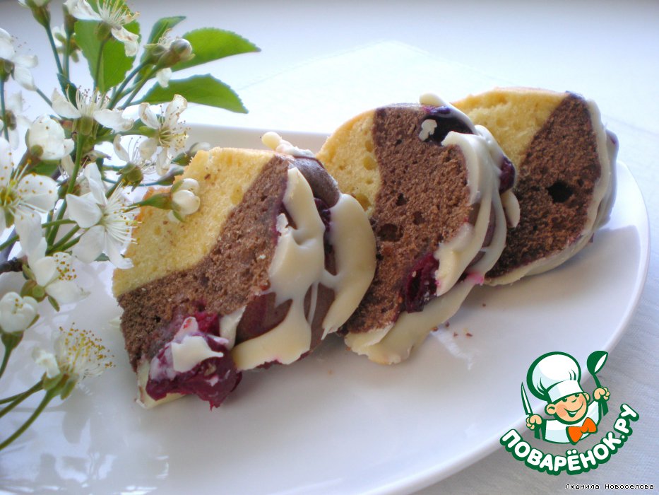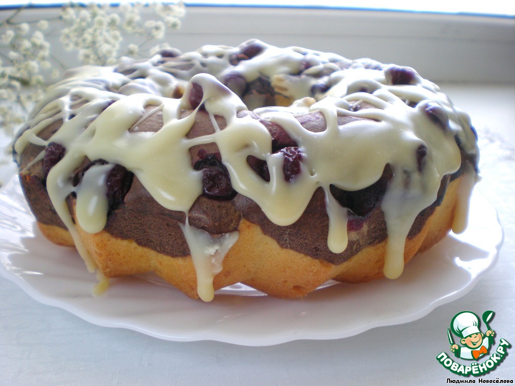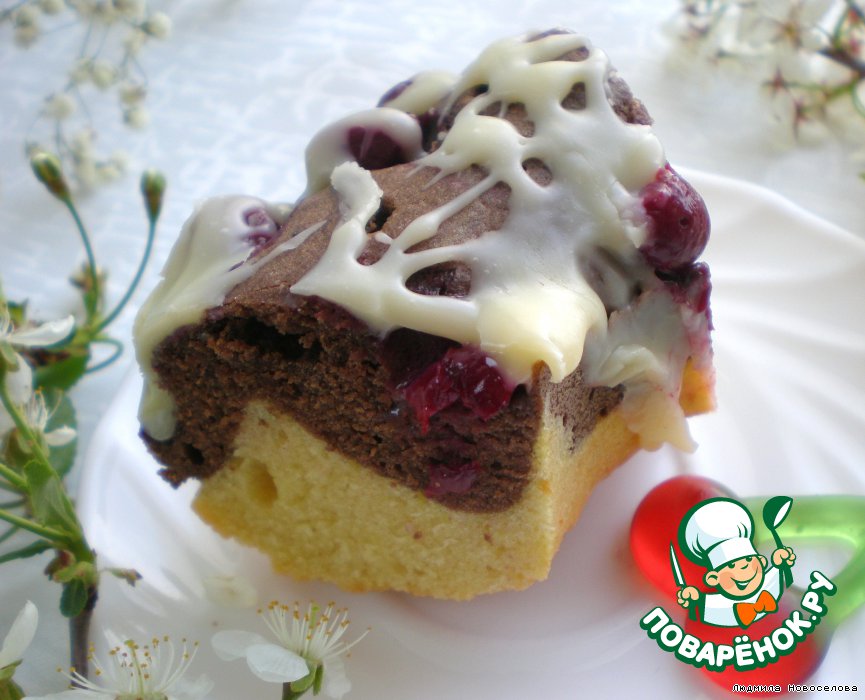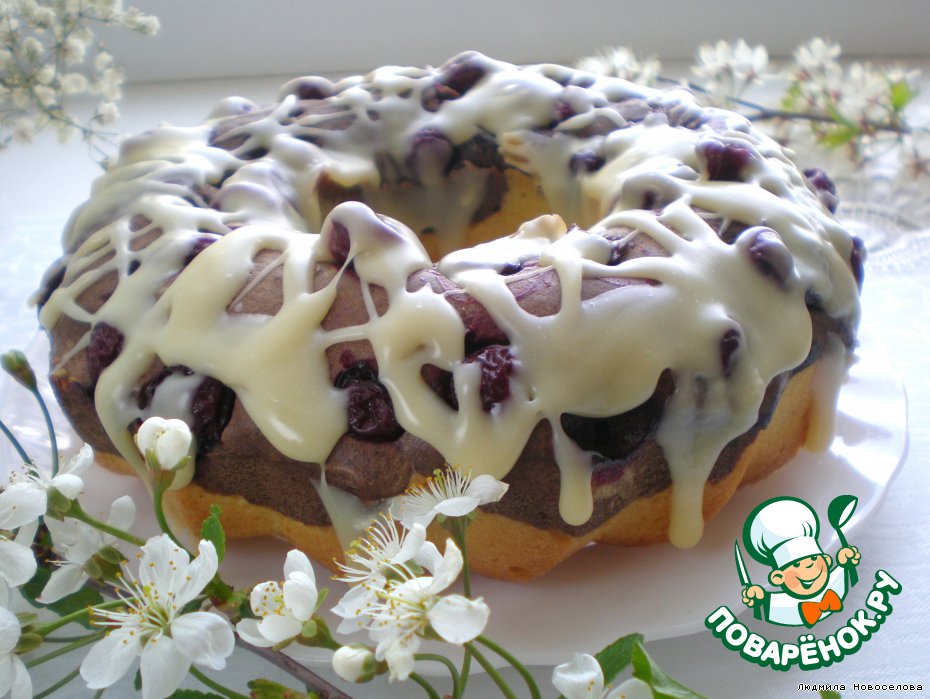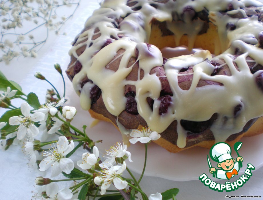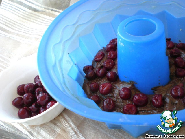 Сверху раскидываем вишни и ставим в духовку, разогретую до 180 градусов, приблизительно на 30 мин. Проверяем на сухую спичку.
