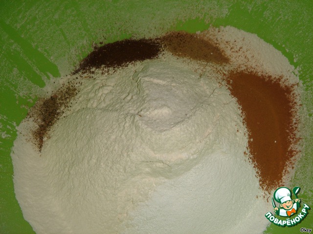 Просеять сухие ингредиенты: муку, соль, разрыхлитель и специи. Пусть Вас не пугает душистый перец. Он очень гармонично вписывается в общий вкус и аромат кекса.