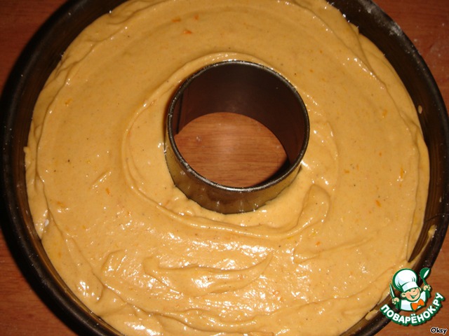 Ввести мучную смесь, перемешать и вылить в форму, смазанную маслом и присыпанную мукой. Автор пишет, что рецепт рассчитан на две формы для кекса размером 9Х5Х3 дюйма (23Х13Х8 см). Я пекла в круглой форме с дыркой, кекс так поднялся, что не просто стал выше бортов, а покрыл их шапкой. Так что подбирайте очень большую форму.