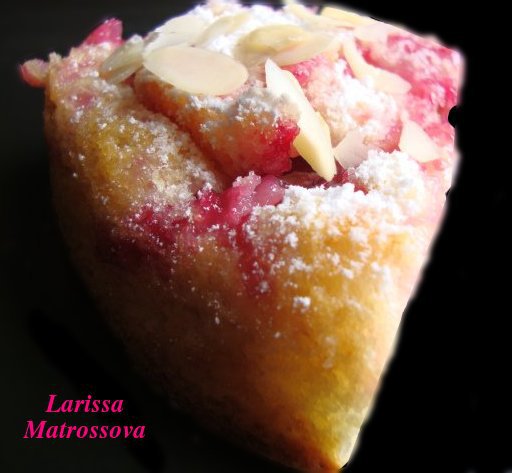 Так как фрукты кисленькие, я посыпала пирожок сахарной пудрой. По желанию вы можете украсить миндальными листиками.