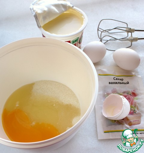 Сахар, яйца, ванильный сахар взбить в пышную массу. Добавить сметану, хорошо размешать.