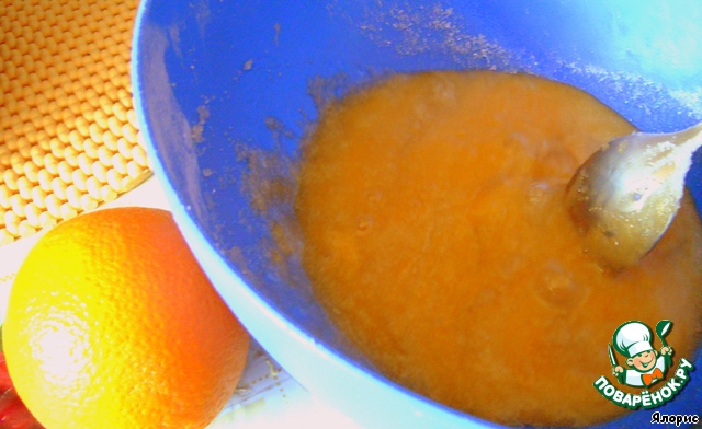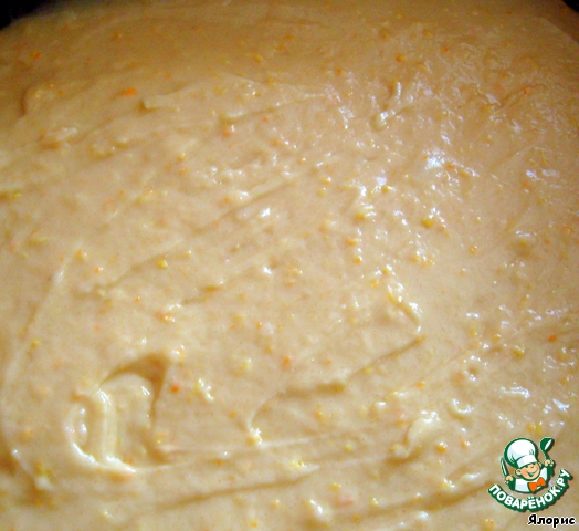 Взбиваем яйца с сахаром и разрыхлителем, постепенно добавляем мелко натертую цедру одного апельсина и муку.