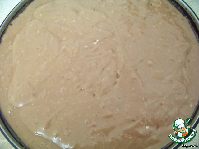 Далее берем форму, смазываем маслом, выкладываем примерно половину теста (довольно жидкое, как сметана), сверху начинку
