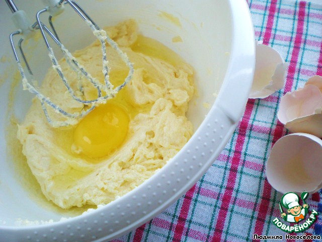 Мягкое сливочное масло взбить с сахаром и ванильным сахаром до пышности, по одному добавлять яйца, продолжая взбивать не менее минуты после каждого яйца.