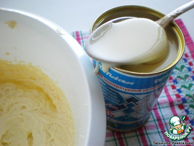 Добавить в массу по-немногу сгущенное молоко, продолжая взбивать.