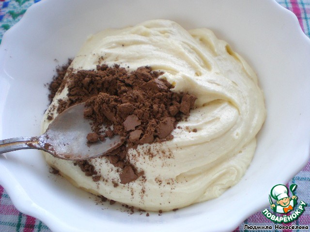 Добавляем просеянную муку с разрыхлителем, хорошо вымешиваем и делим тесто на 2 равные части, в одну добавляем какао и размешиваем.