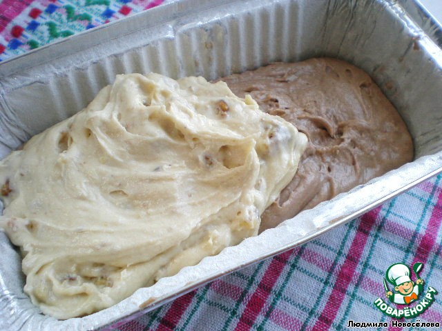 Формочку смазываем маслом, посыпаем мукой и выкладываем тесто с добавлением какао.