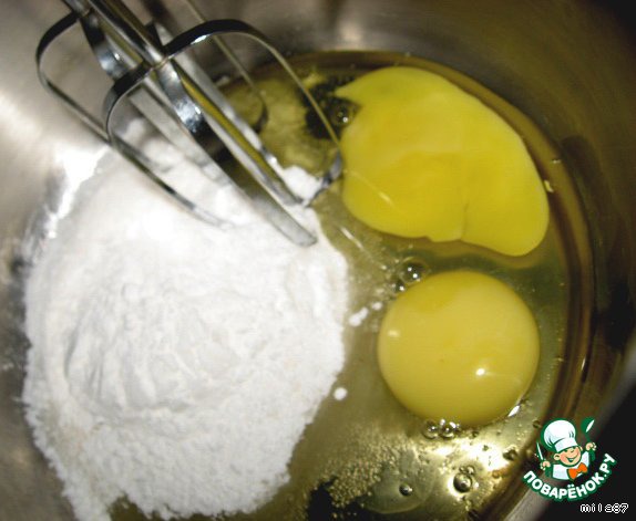 Взбиваем яйца с сахаром(я использовала оставшуюся от мастики пудру)...