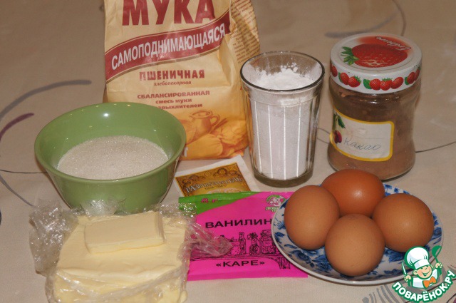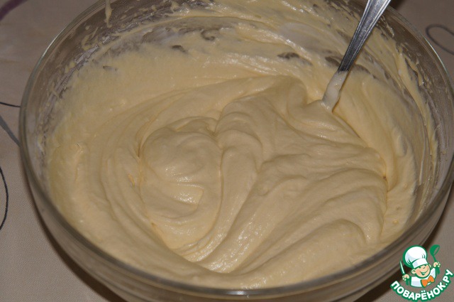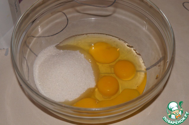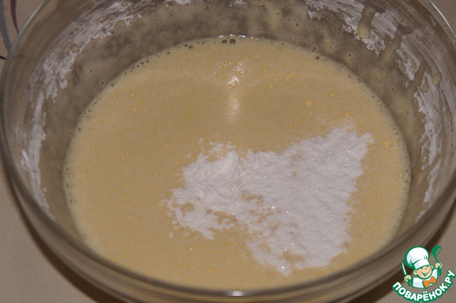 Яйца взбить с сахаром, добавить ванильный ароматизатор и крахмал, перемешать.