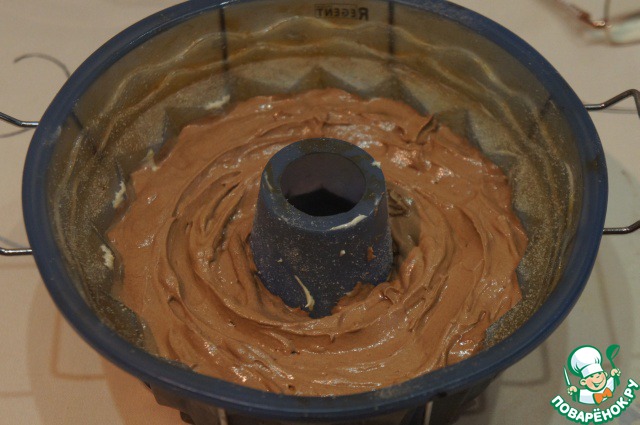 Выложить в форму светлое тесто, сверху аккуратно выложить темное тесто, разровнять, затем провести по центру ножом неглубокую бороздку. Выпекать при 160-170*С в течение 50-60 минут до сухой зубочистки.