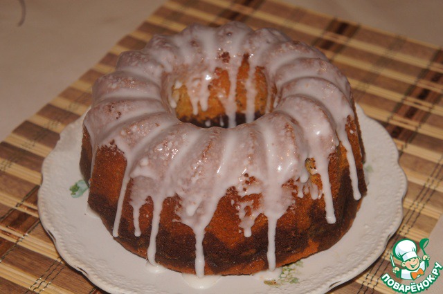 Затем кекс извлечь из формы и покрыть любой глазурью (у меня лимонная), например: 1 стакан сахарной пудры и 2 ст. л. или чуть больше воды.