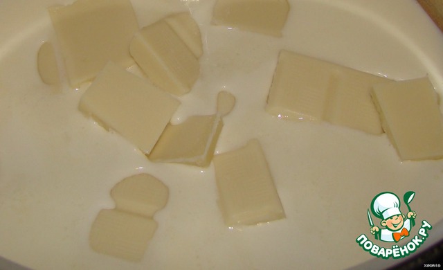 Для начала ним надо приготовить начинку.Сливки (лучше брать самые жирные) нагреем ,поломаем шоколад и растворяем в сливках.(Я когда начала готовить поняла что белого шоколада у меня не достаточно.И добавила до нормы десертного.Для тех кто не любит белый шоколад.Вы можете его заменить на любой другой.Молочный,десертный.черный.Затем остудите сливки и поставьте в холодильник на 2 часа.(Это касается белого шоколада.Если готовите с другим то достаточно просто остудить )