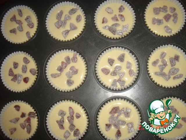 Я сверху выложила нарезанную на кусочки вяленую клубнику. А вообще, можете добавлять в тесто все, что вам нравится: изюм, цукаты, тертый шоколад и т. п.