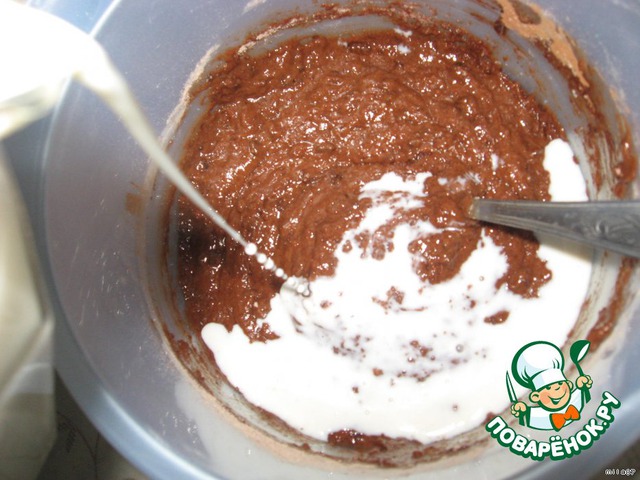 Добавляем немного молока чтобы тесто стало пожиже.Тут все зависит от плотности муки, кому-то молоко может вообще не понадобиться....тесто должно быть густым,но в то же время немного литься.