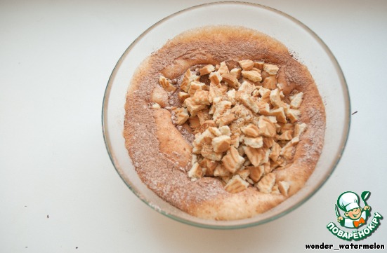 Добавить просеянную муку с какао-порошком и поломанное печенье.