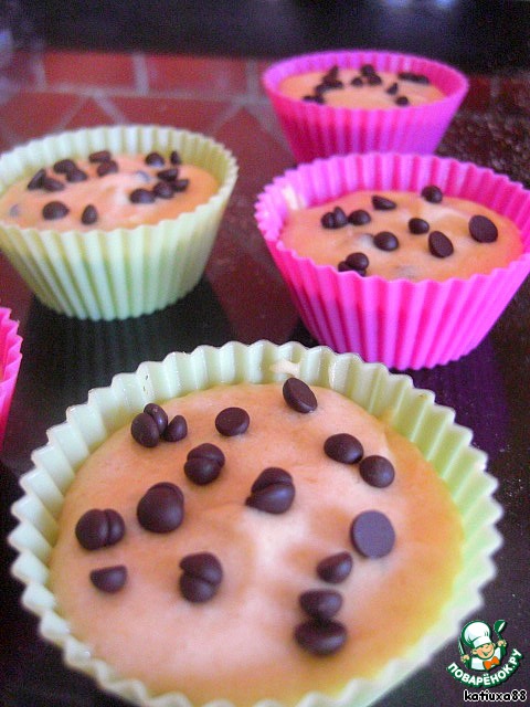 Наполните формочки на 3/4,посыпте оставшимися шоколадными каплями и выпекайте в предварительно разогретой духовке (180°), 15-20 минут.