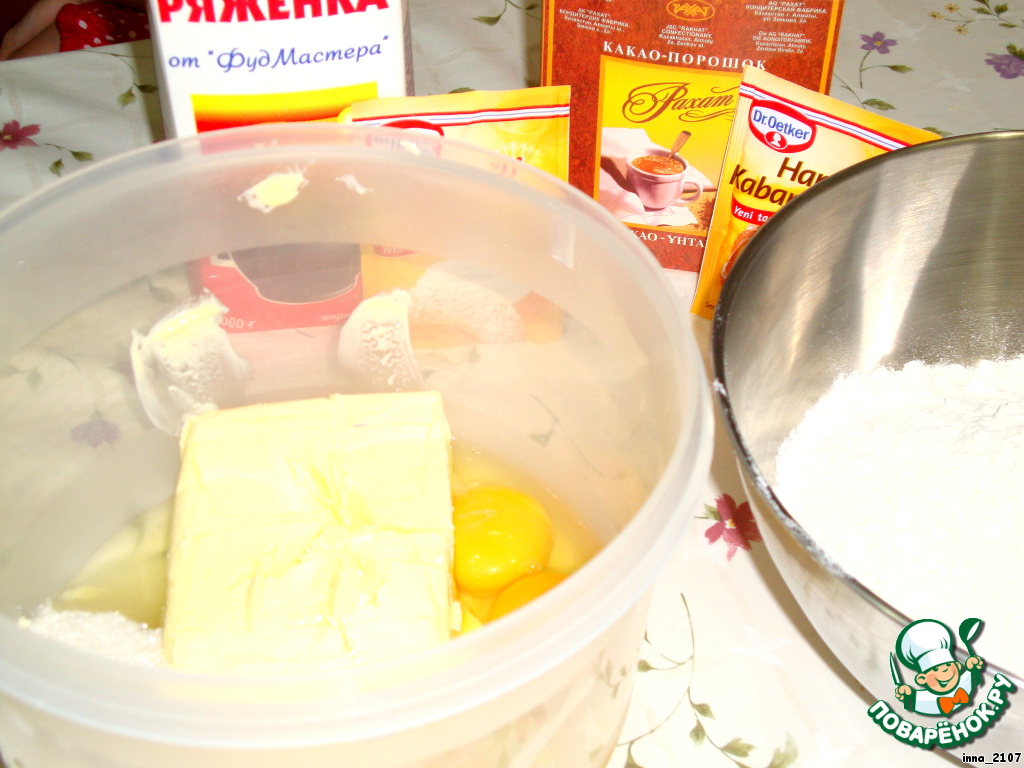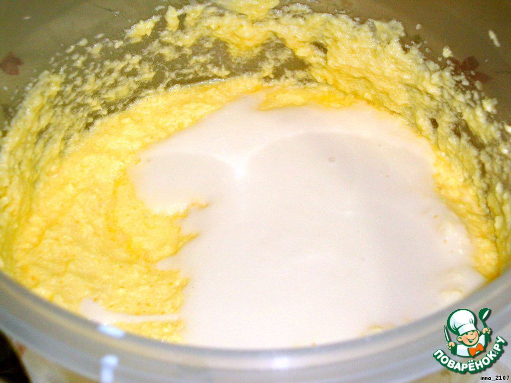 Яйца взбить с размягченным маслом и сахаром, затем влить ряженку и еще немного взбить.