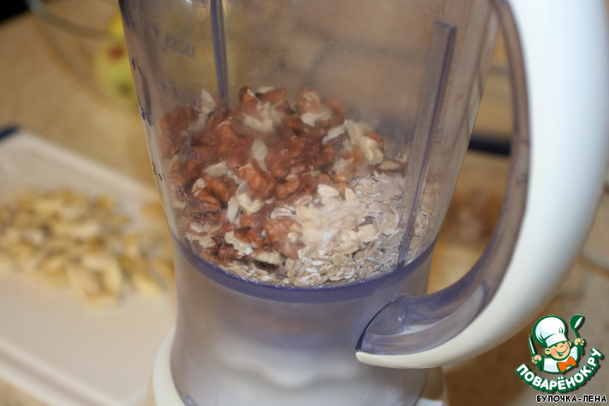 Орехи (лучше миндаль) и овсяные хлопья перемалываем в блендере в крошку.