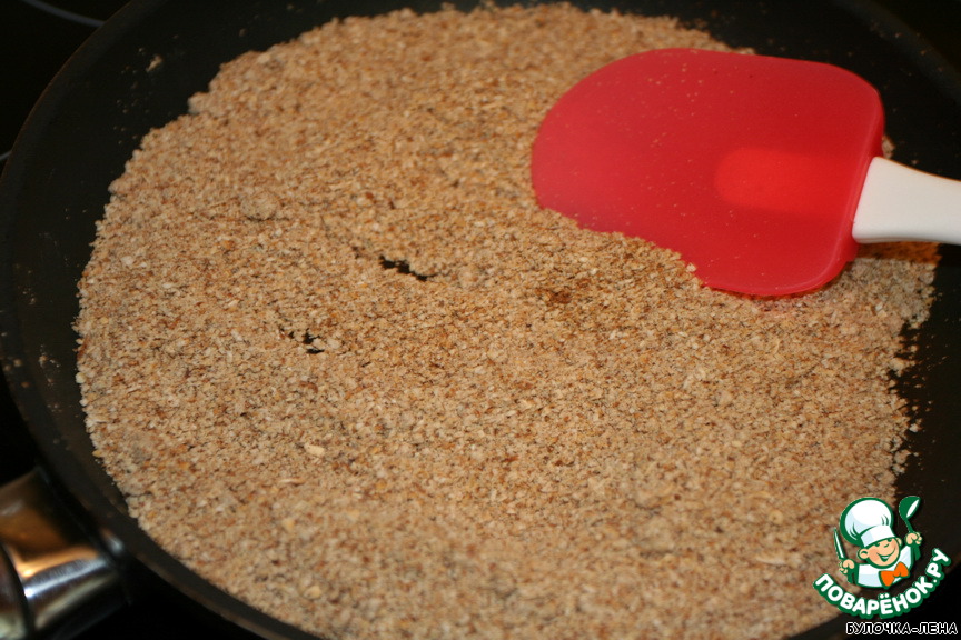 Немного поджарим получившуюся крошку на среднем огне до легкого подрумянивания, пока масса не даст аромата жареной овсянки и орехов. Интенсивность поджарки выбирайте из индивидуальных предпочтений, возможно, вам больше нравится, вообще, сырое.