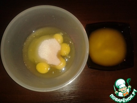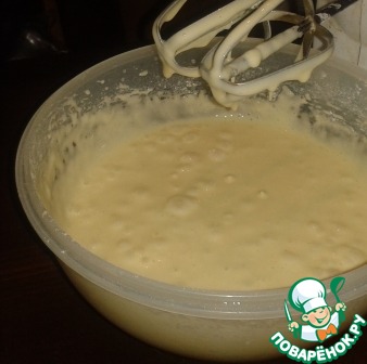 Добавляем в яйца сахар, ванильный сахар. Взбиваем миксером. Далее в тексте фото с тестом и миксером для наглядности густоты теста. Не надо мучиться с "взбить до пиков", не надо добиваться особой гладкости полученного теста. Просто взбиваем недолго и всё.