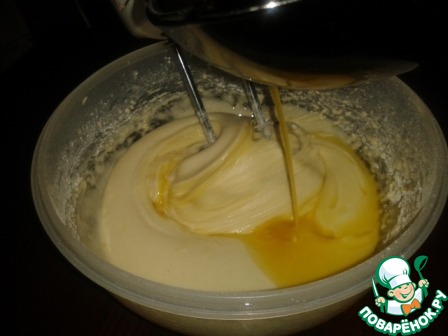 Далее, вливая растопленное масло (либо маргарин), продолжаем перемешивать тесто.