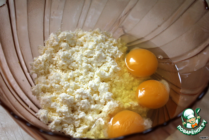 Творог (я делаю сама, по этому рецепту:http://www.povarenok.ru/recipes/show/57408/) перемешать с яйцами.