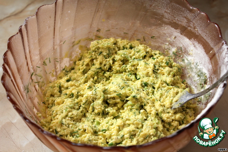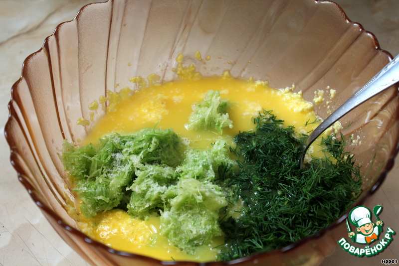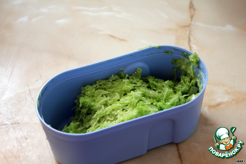 Кабачок натираем на мелкой терке (если есть лишняя жидкость - отжимаем)