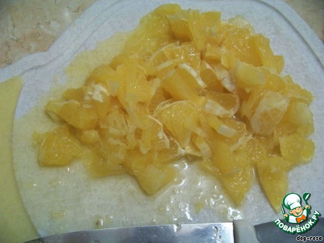 Режем апельсин кусочками, выкладываем вместе с соком в смесь.