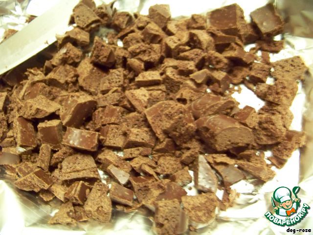 Шоколад режем (я брала пористый, горький), кладем туда же.