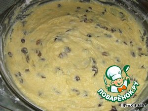 Добавить взбитые яйца, изюм, муку и вымесить тесто.