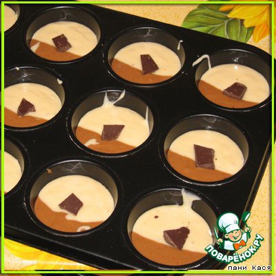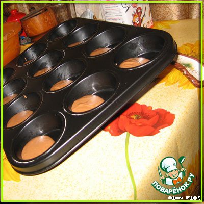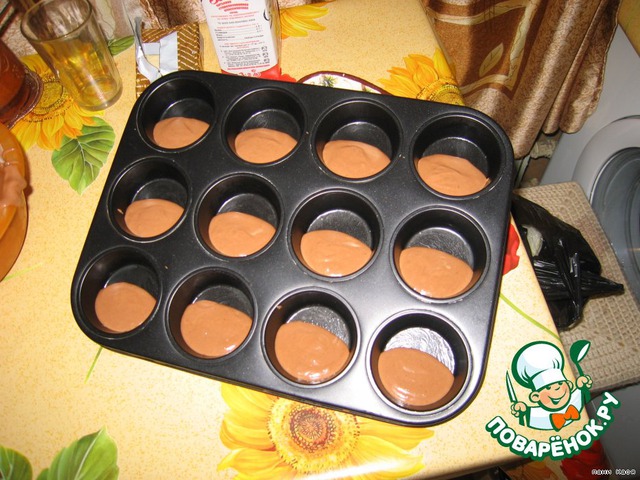 положить в каждую формочку шоколадное тесто (примерно по 1 столовой ложке, большой!)