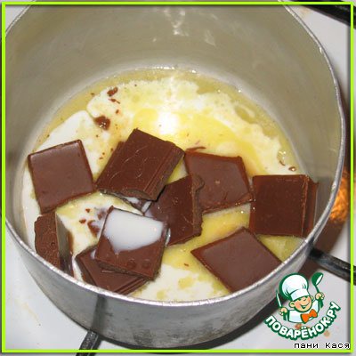 растопленный шоколад замешать в 1 взбитое яйцо, туда же замешать сметану с содой (1 мисочку), добавить 1/2 стакана муки