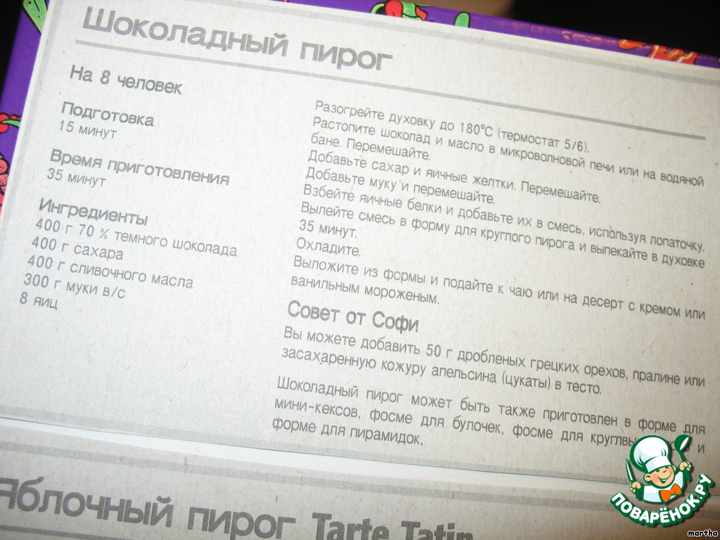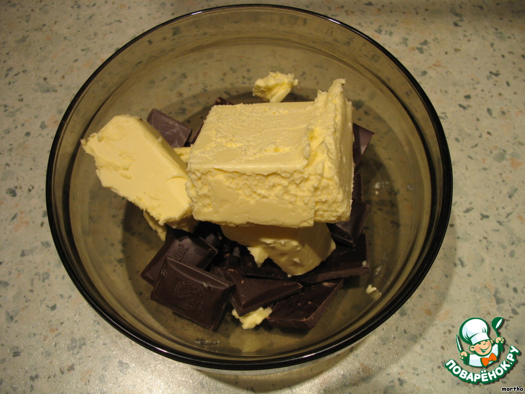 Ингредиенты: 400 гр 70% тёмного шоколада; 400 гр. сахара, 400 гр. сливочного масла, 300 г муки в/с; 8 яиц.