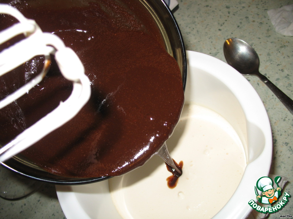 В желточный микс влить шоколадную массу.
